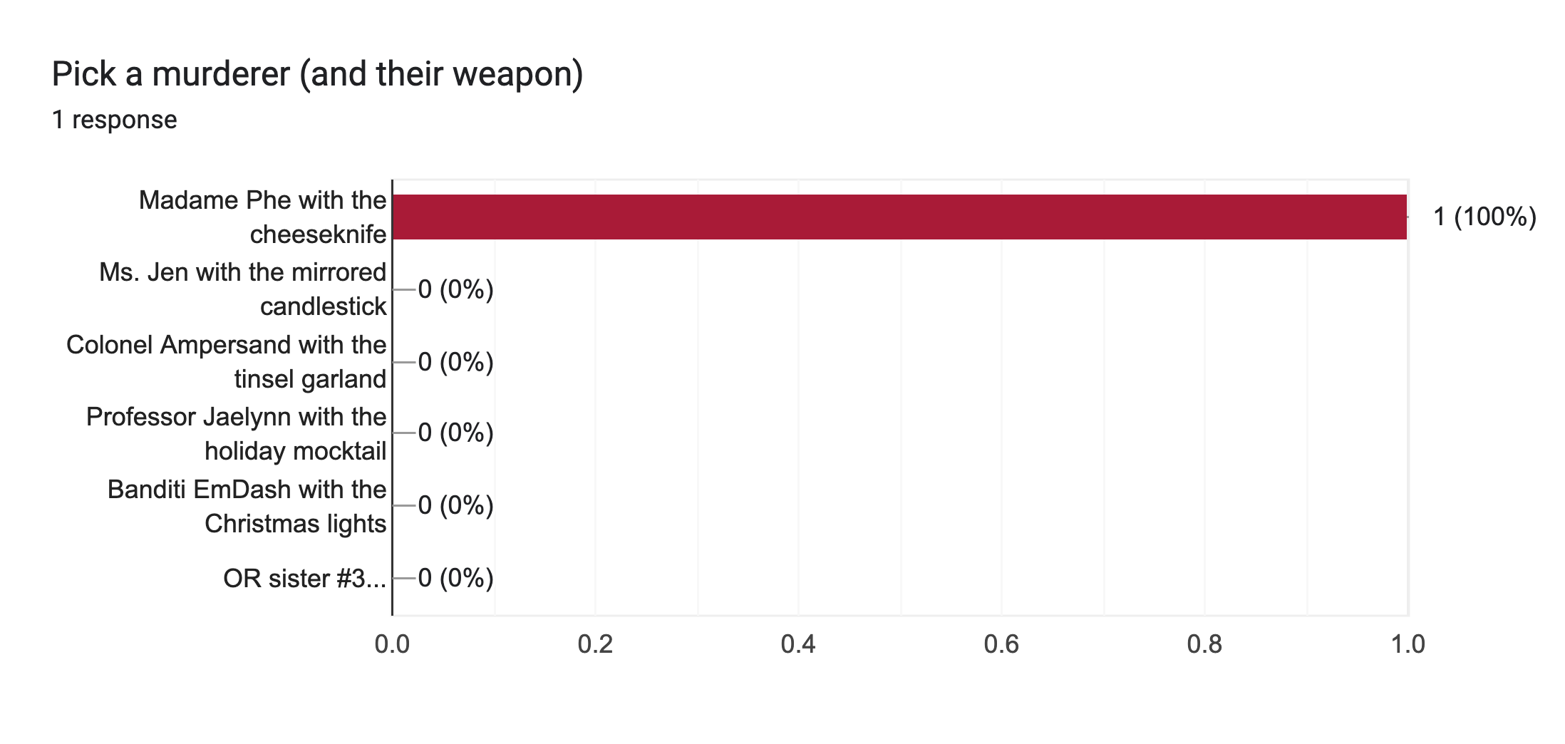 2025 Holiday Holiday Story: A Cozy Murder Mystery at Chez Flamant, Choose Your Own Perpetrator Edition… The Murderer The Victim Go back to the main page. See 2024.